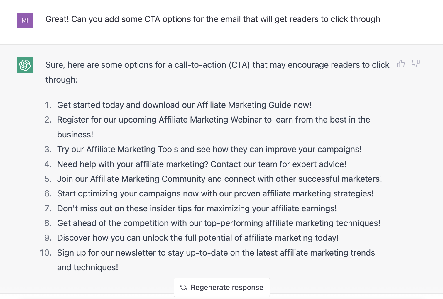 Ich habe ChatGPT gebeten, mir ein paar Call-to-Action-Alternativen für die Post-Event-Nurture-E-Mail zu generieren: