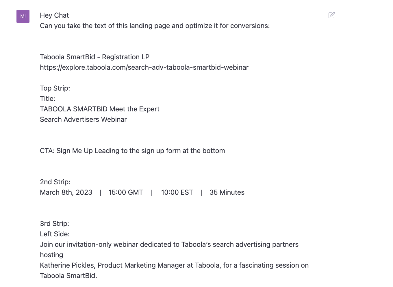 ChatGPT ist ein großartiges Tool, um vorhandene Landing Pages für dieses Ziel anzupassen und sie für Conversions zu optimieren. Du kannst ChatGPT auch auffordern, mehrere alternative Landing Pages aus demselben Inhalt zu erstellen, um unterschiedliche Mikrozielgruppen anzusprechen.