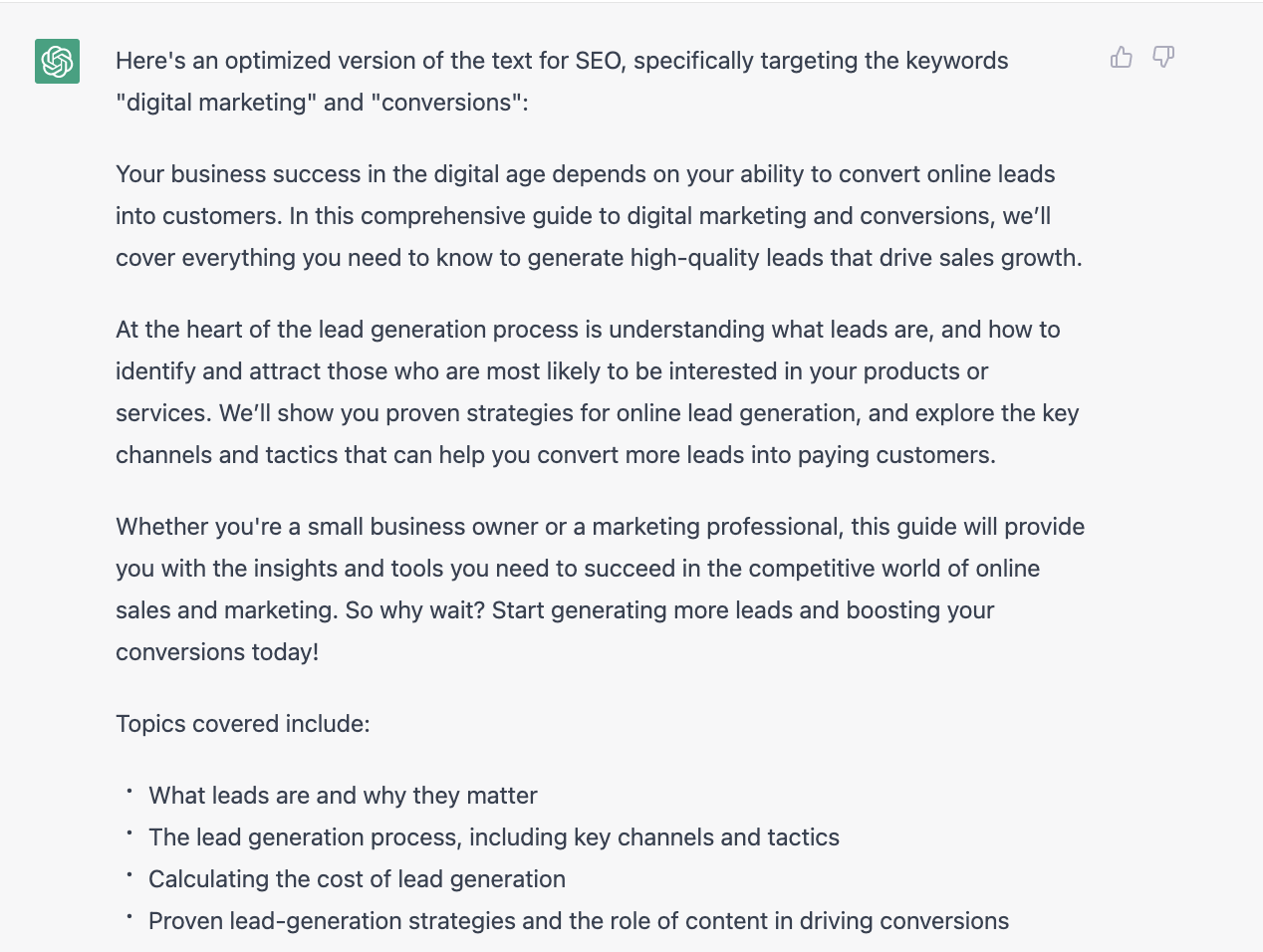 Hier ist ein Beispiel für eine Anfrage, die ich an ChatGPT gestellt habe, um das Intro zu diesem Blogbeitrag für SEO und speziell für zwei Schlüsselwörter zu optimieren: #conversions #digitalmarketing: