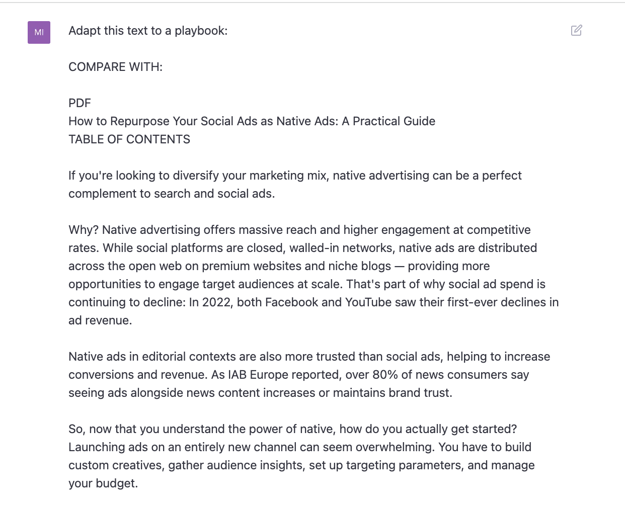 Hier ist ein einfaches Beispiel: Ich habe das Skript genommen, das wir für ein Webinar zum Thema Repurposing Social Ads for Native verwendet haben (erkennst du den Twist? 🙂) und im Prompt darum gebeten, es in ein Playbook zu verwandeln: